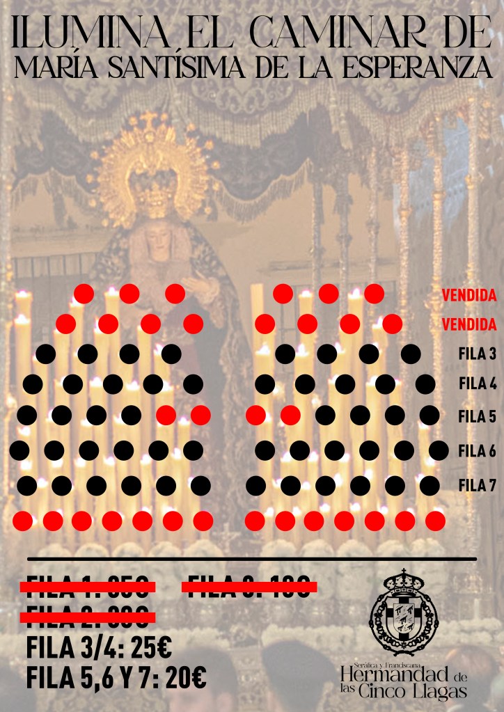 La Mayordomía de la Hermandad pone en marcha la Campaña «Ilumina el caminar de María Santísima de la Esperanza». Hermanos y devotos tendrán la posibilidad de aportar la cuantía económica correspondiente a uno o varios cirios que compondrán la candelería que iluminará el paso de palio de María Santísima de la Esperanza durante la estación de penitencia de la Madrugada Santa 2024.