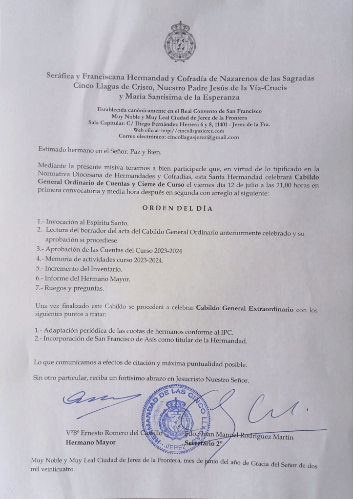 Mediante la presente misiva tenemos a bien participarle que, en virtud de lo tipificado en la Normativa Diocesana de Hermandades y Cofradías, esta Santa Hermandad celebrará Cabildo General Ordinario de Cuentas y Cierre de Curso el viernes 12 de julio a las 21:00 horas, en primera convocatoria, y media hora después en segunda, con arreglo al siguiente orden del día: