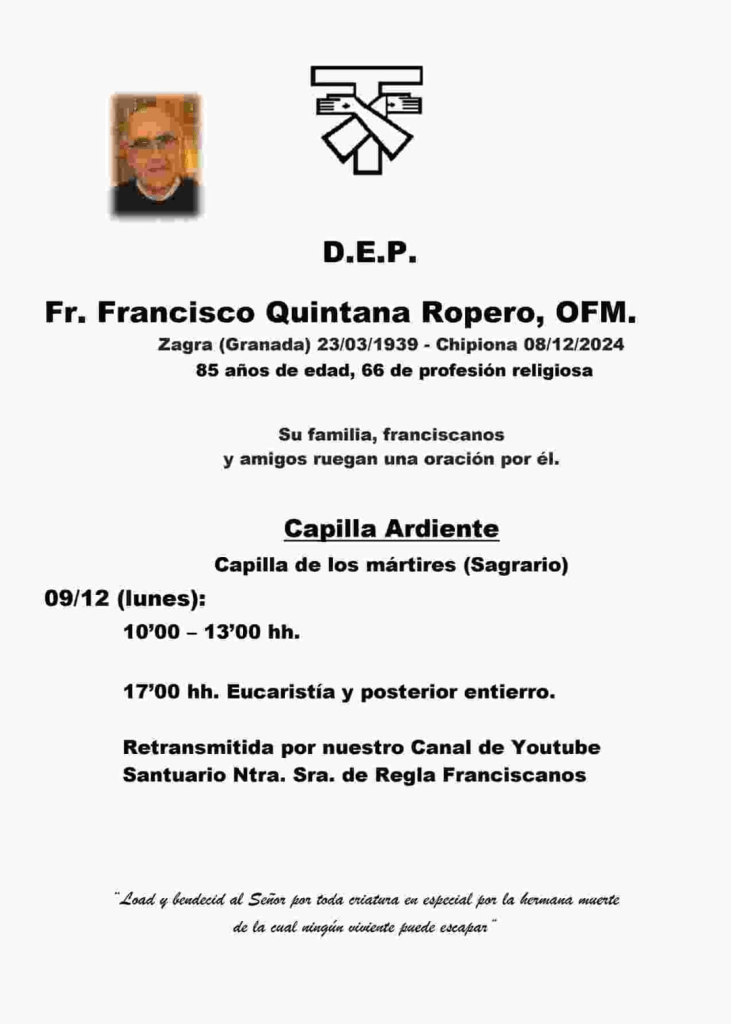 Las exequias por su eterno descanso se celebrarán hoy lunes día 9 a las 17,00 horas en el Santuario de Ntra. Sra. de Regla de Chipiona.