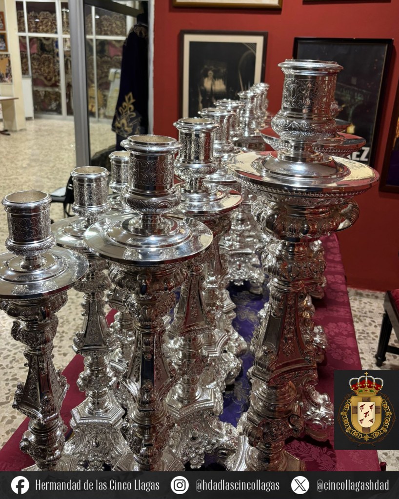 En la tarde de este jueves 16 de enero, ha sido entregada la primera de las dos fases de la restauración de la candelería del paso de palio de María Santísima de la Esperanza. Los trabajos han sido acometidos por el orfebre jerezano D. Antonio García Falla, a quien agradecemos tan encomiable labor al recuperar el esplendor perdido con los años en estas piezas de orfebrería de un incalculable valor artístico.