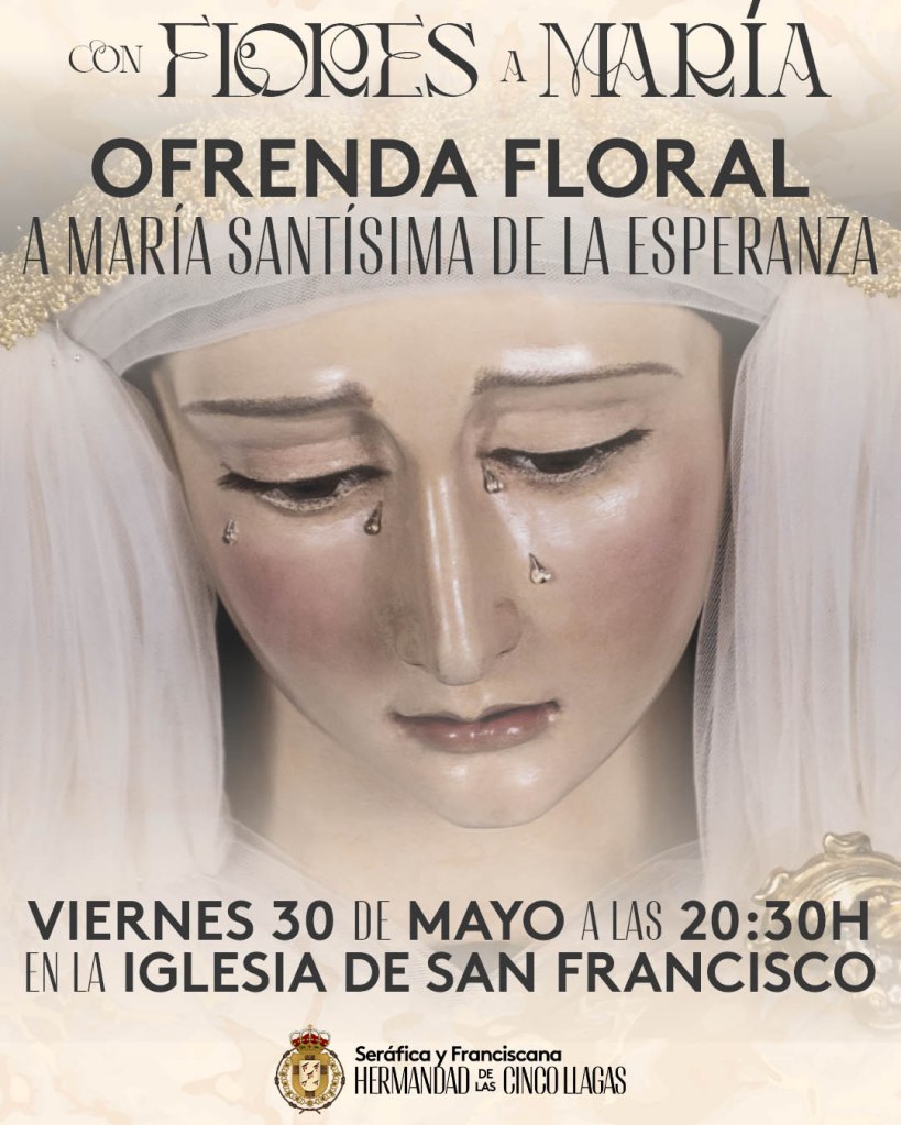 En esta ocasión, la tradicional ofrenda floral a las plantas de nuestra Madre tendrá lugar el próximo viernes 30 de mayo, víspera de la fecha del Rezo del Santo Rosario Vespertino que presidirá María Santísima de la Esperanza. El acto se desarrollará en la Capilla del Voto de la Iglesia de San Francisco a las 20:30 horas.