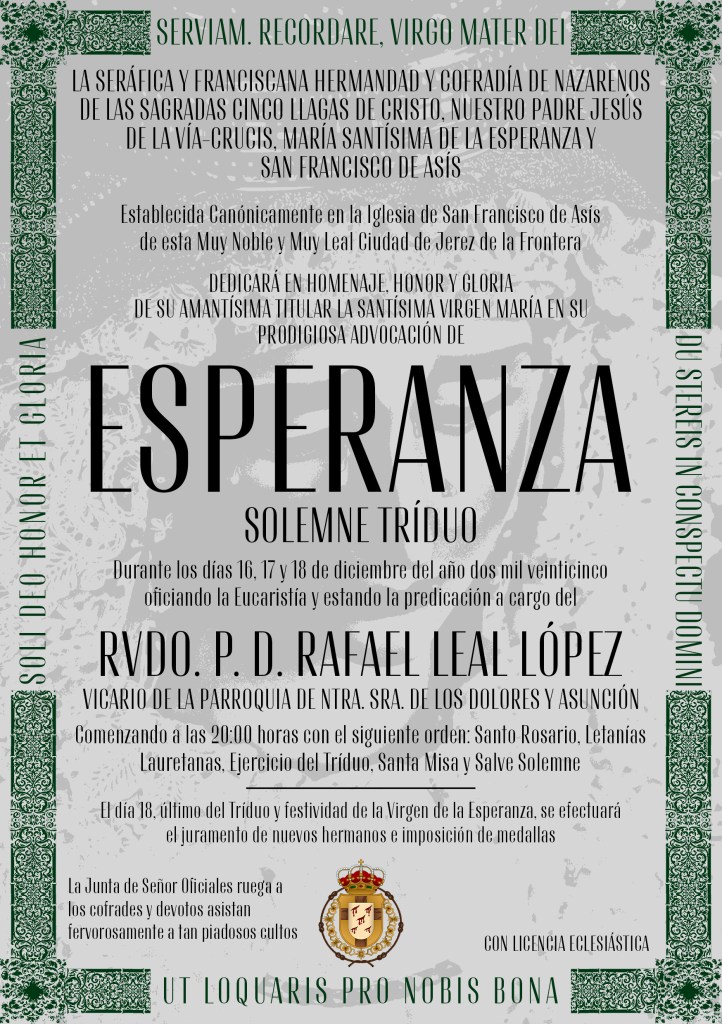 Dedicará en homenaje, honor y gloria de su Amantísima Titular la Santísima Virgen María en su prodigiosa advocación de Esperanza, Solemne Triduo durante los días 16, 17 y 18 de diciembre del año dos mil veinticinco oficiando la Eucaristía y estando la predicación a cargo del Rvdo. P. D. Rafael Leal López, Vicario de la Parroquia de Nuestra Señora de los Dolores y Asunción.
